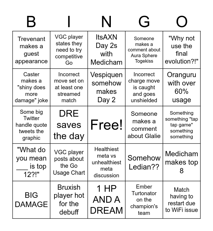 This bingo card has a free space and 24 words: VGC player posts about the Go Usage Chart, Bruxish player hot for the debuff, Vespiquen somehow makes Day 2, BIG DAMAGE, "Why not use the final evolution?!", Trevenant makes a guest appearance, Caster makes a "shiny does more damage" joke, VGC player states they need to try competitive Go, Someone makes a comment about Glalie, Healthiest meta vs unhealthiest meta discussion, Incorrect charge move is caught and goes unshielded, Some big Twitter handle quote tweets the graphic, Somehow Ledian??, Medicham makes top 8, Incorrect move set on at least one streamed match, Ember Turtonator on the champion's team, Something something "tap tap game" something something, ItsAXN Day 2s with Medicham, Oranguru with over 60% usage, DRE saves the day, Match having to restart due to WiFi issue, "What do you mean ___ is top 12?!", Someone makes a comment about Aura Sphere Togekiss and 1 HP AND A DREAM.