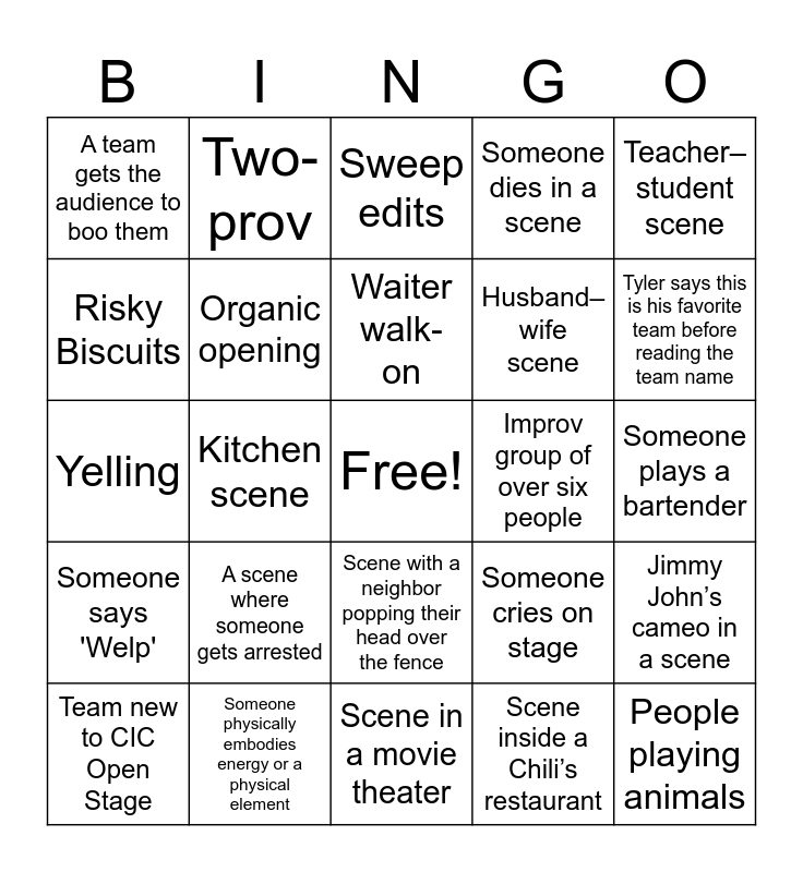 This bingo card has a free space and 76 words: Suggestion of anything at all, Walk-on, Sweep edits, Tag-outs, Someone sings, Pandering for a Challenge coin, Car scene, Office break room, Someone getting fired, Someone pulls gun in a scene, Someone saying 'cut to', Someone playing a little kid, Waiter walk-on, Risky Biscuits, A first 'first day' scene, Kitchen scene, Southern accents, People playing animals, Pun, Teacher–student scene, Doctor–patient scene, Yelling, Organic opening, Two-prov, Someone dies in a scene, Fourth wall break, Scene in an office break room, Someone breaks character, Talking on the sidelines, Someone goes into the audience, Bows after improv set, Someone lays on the floor, Someone plays an Uber driver, Someone cries on stage, Tyler says this is his favorite team before reading the team name, Husband–wife scene, First date scene, Someone plays a famous person, Someone plays a bartender, Scene inside a Chili’s restaurant, Scene inside a public bathroom, Suggestion of a location that would fit on this stage, A scene with kids in detention, Jam, A scene with a family dinner, Someone makes sound effects from the sidelines, Team new to CIC Open Stage, A team gets the audience to boo them, Scene at the beach, Someone forgets a character name, Two scenes happening at the same time, Scene with a neighbor popping their head over the fence, Scene in an office, Scene in a pet store, Someone does a monologue, A scene with a priest confessional, Someone standing on a chair, A scene where someone is fired, Monoscene, Scene on a camping trip, A scene where someone gets arrested, A scene with a pitch meeting, The set makes a callback, Someone gets a challenge coin, Someone acts as an inanimate object, Someone plays a detective, Improv group of over six people, Two characters having a breakup, Someone pimps their scene partner into doing stand-up, Therapist scene, Jimmy John’s cameo in a scene, Someone says 'Welp', Someone physically embodies energy or a physical element, Anything 9/11 related, Scene in a movie theater and Scene at a funeral.