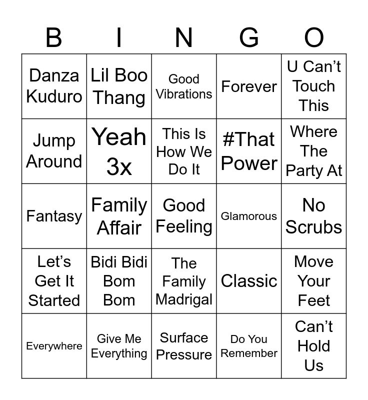 This bingo card has 60 words: Last Friday Night, Give Me Everything, Boyfriend, Let’s Get It Started, Do You Remember, Just Dance, Yeah 3x, Let’s Groove, #That Power, D.J. Got Us Falling In Love, Forever, Girls Just Want To Have Fun, Jump Around, Macarena, Suavemente, Danza Kuduro, Good Feeling, U Can’t Touch This, Wannabe, This Is How We Do It, Glamorous, Good Vibrations, Everywhere, Move Your Feet, Treasure, September, Apache, Tootsee Roll, Where The Party At, Livin It Up, All Falls Down, Step In The Name Of Love, O.M.G., I Need a Girl Part II, Lil Boo Thang, Die Young, Hey Baby, Family Affair, Just Fine, Fantasy, La Chona, Bidi Bidi Bom Bom, No Scrubs, Everybody, Classic, I Like To Move It, Un Poco Loco, Proud Corazon, You’re Welcome, The Family Madrigal, Surface Pressure, We Don’t Talk About Bruno, I’ve Got A Dream, Chillin Like A Villian, Come And Get Your Love, Break Your Heart, Steve’s Lava Chicken, I Had Some Help, Can’t Hold Us and The Way You Make Me Feel.