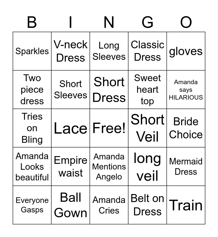 This bingo card has a free space and 31 words: Amanda Cries, Mother of the bride cries, Lace, Bow, Sparkles, Long Sleeves, Short Sleeves, long veil, Short Veil, Belt on Dress, Bride Choice, Train, Dress has flowers, Pockets, Amanda says HILARIOUS, A line dress, Mermaid Dress, Empire waist, Amanda Looks beautiful, Amanda Mentions Angelo, gloves, buttons, Everyone Gasps, V-neck Dress, Sweet heart top, Two piece dress, Classic Dress, Tries on Bling, Ball Gown, Short Dress and Brides choice.