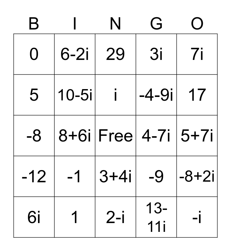 This bingo card has a free space and 24 words: -1, 1, i, 6i, 7i, 0, 5, 6-2i, 4-7i, 3+4i, -4-9i, -8, -9, -8+2i, 10-5i, 13-11i, 5+7i, 29, 17, 8+6i, -i, -12, 3i and 2-i.