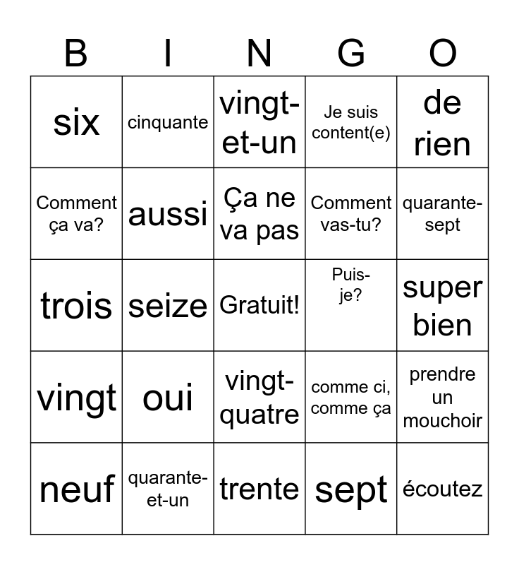This bingo card has a free space and 24 words: oui, quarante-et-un, Ça ne va pas, neuf, de rien, six, Comment ça va?, cinquante, Puis-je?, vingt-quatre, Comment vas-tu?, trois, comme ci, comme ça, prendre un mouchoir, aussi, sept, super bien, vingt-et-un, quarante-sept, seize, écoutez, vingt, Je suis content(e) and trente.