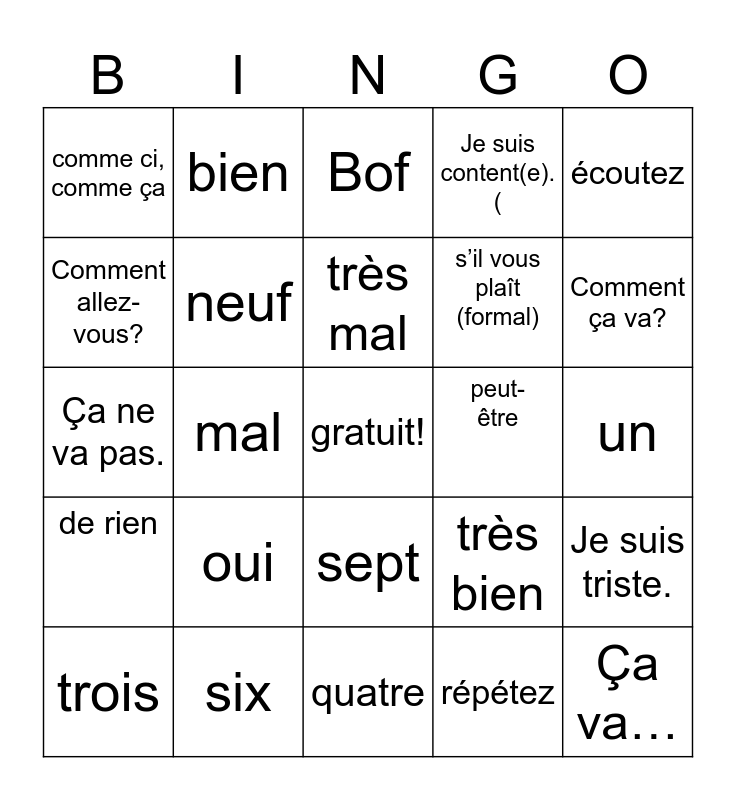 This bingo card has a free space and 24 words: oui, six, très mal, trois, écoutez, comme ci, comme ça, Comment allez-vous?, bien, peut-être, sept, s’il vous plaît (formal), Ça ne va pas., très bien, Je suis triste., neuf, répétez, un, Bof, Comment ça va?, mal, Ça va…, de rien, Je suis content(e). ( and quatre.