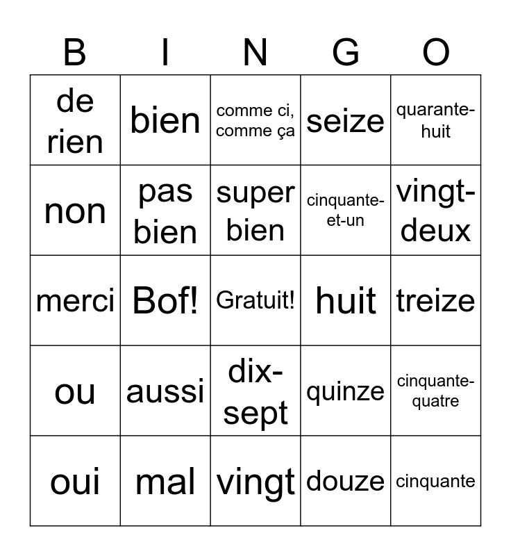 This bingo card has a free space and 24 words: oui, aussi, super bien, douze, quarante-huit, de rien, bien, comme ci, comme ça, huit, treize, merci, pas bien, quinze, cinquante-quatre, non, mal, vingt, seize, vingt-deux, ou, Bof!, dix-sept, cinquante-et-un and cinquante.