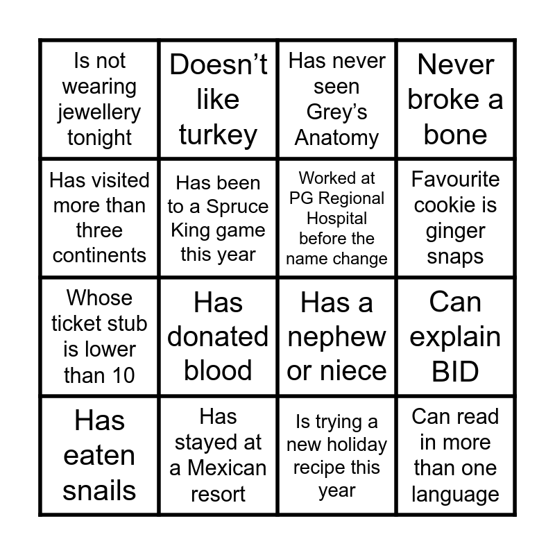 This bingo card has 20 words: Can explain BID, Knows what MMSE stands for, Has never seen Grey’s Anatomy, Can quote a line from Scrubs, Has eaten snails, Has visited more than three continents, Has stayed at a Mexican resort, Is not wearing jewellery tonight, Whose ticket stub is lower than 10, Doesn’t like turkey, Has donated blood, Has a nephew or niece, Has been to a Spruce King game this year, Can read in more than one language, Worked at PG Regional Hospital before the name change, Has visited all 5 health authorities, Favourite cookie is ginger snaps, Never broke a bone, Is trying a new holiday recipe this year and Prefers tea over coffee.
