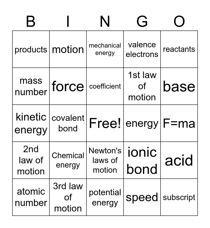 This bingo card has a free space and 24 words: Chemical energy, 3rd law of motion, coefficient, atomic number, reactants, products, mass number, motion, energy, Newton's laws of motion, 1st law of motion, kinetic energy, ionic bond, acid, force, speed, F=ma, mechanical energy, base, covalent bond, subscript, 2nd law of motion, valence electrons and potential energy.