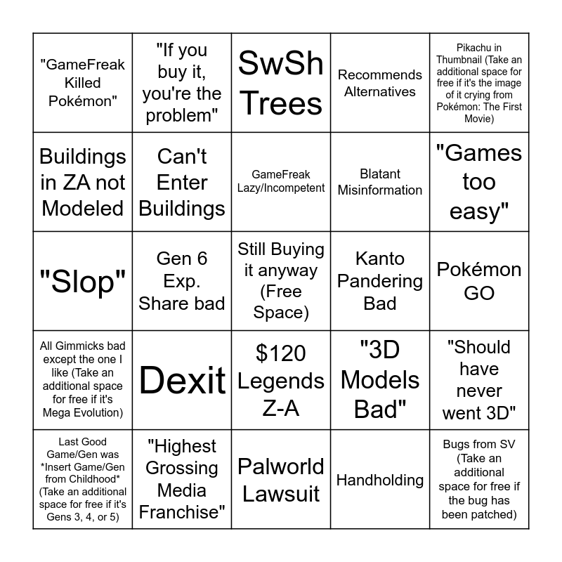 This bingo card has a free space and 24 words: Last Good Game/Gen was *Insert Game/Gen from Childhood* (Take an additional space for free if it's Gens 3, 4, or 5), Dexit, GameFreak Lazy/Incompetent, Handholding, Pikachu in Thumbnail (Take an additional space for free if it's the image of it crying from Pokémon: The First Movie), "GameFreak Killed Pokémon", "If you buy it, you're the problem", SwSh Trees, Kanto Pandering Bad, Pokémon GO, "Slop", Can't Enter Buildings, "3D Models Bad", "Should have never went 3D", Buildings in ZA not Modeled, "Highest Grossing Media Franchise", Palworld Lawsuit, Recommends Alternatives, "Games too easy", All Gimmicks bad except the one I like (Take an additional space for free if it's Mega Evolution), Gen 6 Exp. Share bad, $120 Legends Z-A, Blatant Misinformation and Bugs from SV (Take an additional space for free if the bug has been patched).