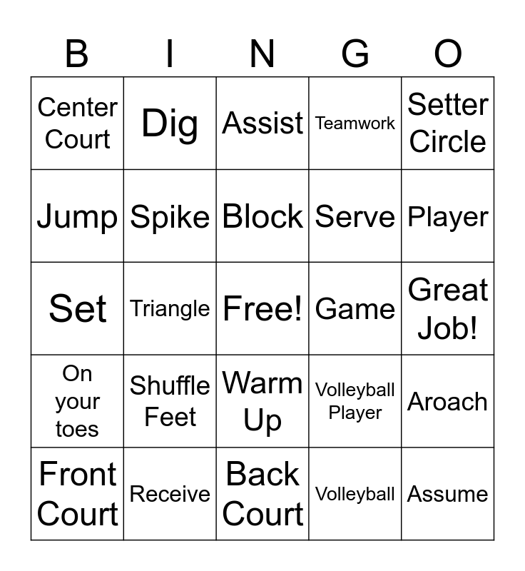 This bingo card has a free space and 25 words: Shuffle Feet, Back Court, Block, Front Court, Setter Circle, Center Court, Jump, Dig, Game, Warm Up, Serve, Set, Volleyball Player, Aroach, Spike, Pass/Bump, Great Job!, Assist, Player, Triangle, Assume, Receive, On your toes, Teamwork and Volleyball.