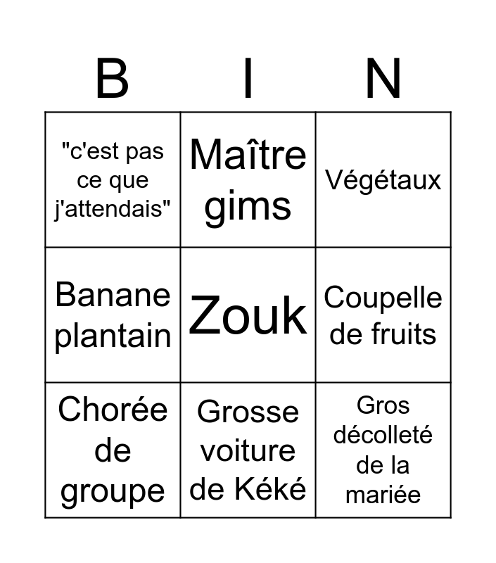 This bingo card has a free space and 8 words: Coupelle de fruits, Végétaux, Maître gims, Chorée de groupe, "c'est pas ce que j'attendais", Gros décolleté de la mariée, Banane plantain and Grosse voiture de Kéké.
