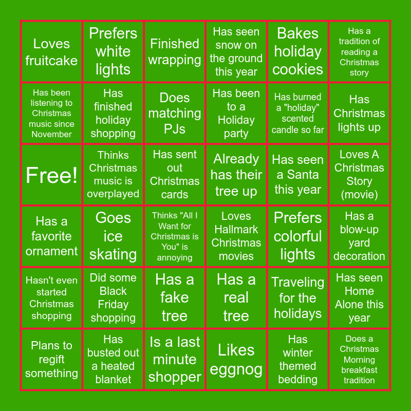 This bingo card has 36 words: Has a real tree, Has a fake tree, Likes eggnog, Has been listening to Christmas music since November, Has a favorite ornament, Already has their tree up, Has finished holiday shopping, Is a last minute shopper, Bakes holiday cookies, Traveling for the holidays, Has Christmas lights up, Has seen snow on the ground this year, Has seen Home Alone this year, Thinks Christmas music is overplayed, Has been to a Holiday party, Loves fruitcake, Hasn't even started Christmas shopping, Has seen a Santa this year, Free!, Finished wrapping, Has sent out Christmas cards, Goes ice skating, Loves Hallmark Christmas movies, Thinks "All I Want for Christmas is You" is annoying, Prefers colorful lights, Prefers white lights, Has burned a "holiday" scented candle so far, Has busted out a heated blanket, Does matching PJs, Has a tradition of reading a Christmas story, Does a Christmas Morning breakfast tradition, Plans to regift something, Has a blow-up yard decoration, Loves A Christmas Story (movie), Did some Black Friday shopping and Has winter themed bedding.