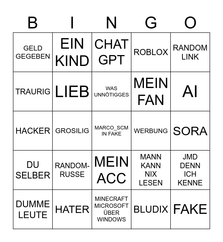 This bingo card has a free space and 24 words: RANDOM- RUSSE, HATER, WAS UNNÖTIGGES, DUMME LEUTE, RANDOM LINK, GELD GEGEBEN, TRAURIG, EIN KIND, WERBUNG, MEIN ACC, MEIN FAN, HACKER, MANN KANN NIX LESEN, JMD DENN ICH KENNE, LIEB, BLUDIX, SORA, CHAT GPT, AI, GROSILIG, FAKE, DU SELBER, ROBLOX and MINECRAFT MICROSOFT ÜBER WINDOWS.
