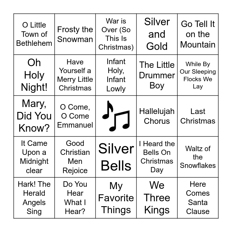 This bingo card has a free space and 100 words: It's Beginning to Look a Lot Like Christmas, All I want for Christmas is You, Last Christmas, Jingle Bell Rock, Jingle Bells, Holly Jolly Christmas, It's the Most Wonderful Time of the Year, Sleigh Ride, Deck the Halls, Run Rudolph Run, Grandma Got Run Over By a Reindeer, Winter Wonderland, I Saw Mommy Kissing Santa Clause, Do You Hear What I Hear?, Joy to the World, I'll Be Home for Christmas, The Little Drummer Boy, You're a Mean One Mr. Grinch, That's Christmas to Me, Blue Christmas, Believe, Marshmallow World, Coventry Carol, Carol of the Bells, What Child is This?, Hallelujah Chorus, Go Tell It on the Mountain, I Heard the Bells On Christmas Day, Light Of Christmas, Angels We Have Heard on High, O Come, O Come Emmanuel, O Little Town of Bethlehem, Come Thou Long Expected Jesus, O Christmas Tree, We Three Kings, Infant Holy, Infant Lowly, Waltz of the Snowflakes, Dance of the Sugar Plum Fairy, Waltz of the Flowers, Magnificat, Sing We Now of Christmas, We Need a Little Christmas, Mary, Did You Know?, Mele Kalikimaka, While By Our Sleeping Flocks We Lay, War is Over (So This Is Christmas), Wonderful Christmas Time, This Christmas, Little Saint Nick, My Favorite Things, Happy Holiday, I Want a Hippopotamus for Christmas, Christmas Canon, Christmas Time is Here, Caroling, Caroling, The Christmas Waltz, Home for the Holidays, Santa Baby, Chestnuts Roasting on an Open Fire, Silver and Gold, Please Come Home for Christmas, Up On The Housetop, All Is Well, Gloria, Here With Us, The Chipmunk Song, When the River Meets the Sea, Here We Come A-Caroling, Angels From the Realms of Glory, Ding Dong Merrily on High, Good King Wenceslas, Good Christian Men Rejoice, In The Bleak Midwinter, Sussex Carol, We Wish You a Merry Christmas, The First Noel, Silent Night, Oh Holy Night!, Oh Come All Ye Faithful, All I Want for Christmas is My Two Front Teeth, Is That You Santa Clause?, Here Comes Santa Clause, I Saw Three Ships, Silver Bells, Away In a Manger, Frosty the Snowman, Rudolph the Red-Nosed Reindeer, God Rest Ye Merry Gentlemen, Feliz Navidad, It Came Upon a Midnight clear, I'm Dreaming of a White Christmas, Baby, It's Cold Outside, The Twelve Days of Christmas, Hark! The Herald Angels Sing, Have Yourself a Merry Little Christmas, Let It Snow! Let It Snow! Let It Snow!, Underneath the Tree, Santa Tell Me, Mistletoe and The Man with the Bag.