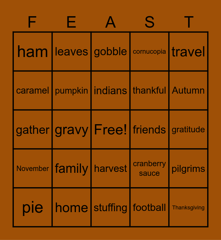 This bingo card has a free space and 29 words: pie, rolls, gravy, turkey, ham, gobble, pumpkin, family, friends, home, gratitude, Thanksgiving, stuffing, football, Autumn, mashed potatoes, harvest, November, travel, gather, cranberry sauce, apples, thankful, caramel, cornucopia, leaves, pilgrims, indians and deer.