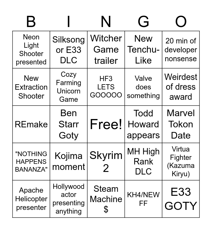 This bingo card has a free space and 24 words: Kojima moment, Hollywood actor presenting anything, HF3 LETS GOOOOO, Apache Helicopter presenter, 20 min of developer nonsense, Neon Light Shooter presented, New Extraction Shooter, Silksong or E33 DLC, Todd Howard appears, Skyrim 2, Valve does something, REmake, MH High Rank DLC, Virtua Fighter (Kazuma Kiryu), Cozy Farming Unicorn Game, KH4/NEW FF, Marvel Tokon Date, Witcher Game trailer, Weirdest of dress award, Ben Starr Goty, E33 GOTY, "NOTHING HAPPENS BANANZA", New Tenchu-Like and Steam Machine $.