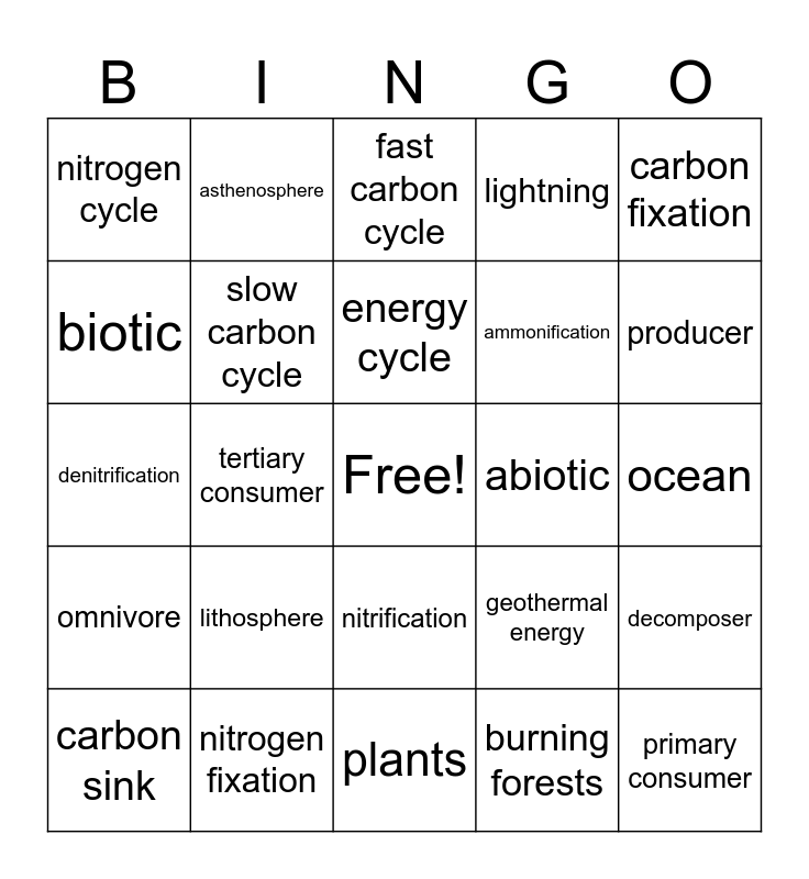 This bingo card has a free space and 24 words: lithosphere, nitrogen fixation, energy cycle, carbon sink, carbon fixation, nitrogen cycle, biotic, asthenosphere, abiotic, nitrification, ammonification, denitrification, geothermal energy, decomposer, slow carbon cycle, burning forests, ocean, fast carbon cycle, producer, tertiary consumer, primary consumer, omnivore, lightning and plants.