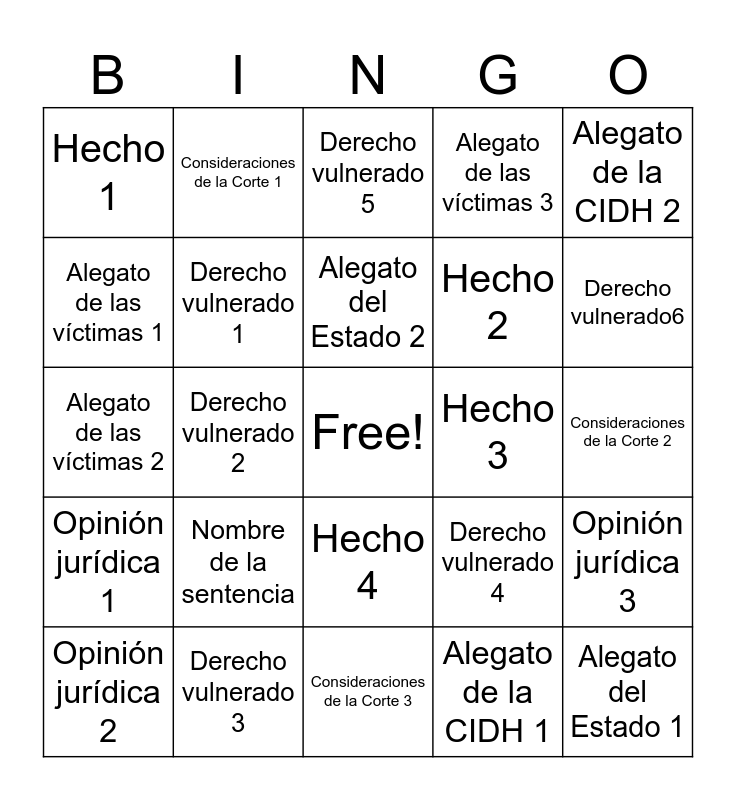 This bingo card has a free space and 24 words: Nombre de la sentencia, Derecho vulnerado 3, Alegato del Estado 2, Opinión jurídica 2, Alegato de la CIDH 2, Hecho 1, Alegato de las víctimas 1, Consideraciones de la Corte 1, Hecho 3, Hecho 4, Hecho 2, Alegato de las víctimas 2, Derecho vulnerado 4, Opinión jurídica 3, Derecho vulnerado 1, Alegato de la CIDH 1, Consideraciones de la Corte 2, Derecho vulnerado 5, Derecho vulnerado6, Derecho vulnerado 2, Alegato del Estado 1, Opinión jurídica 1, Alegato de las víctimas 3 and Consideraciones de la Corte 3.