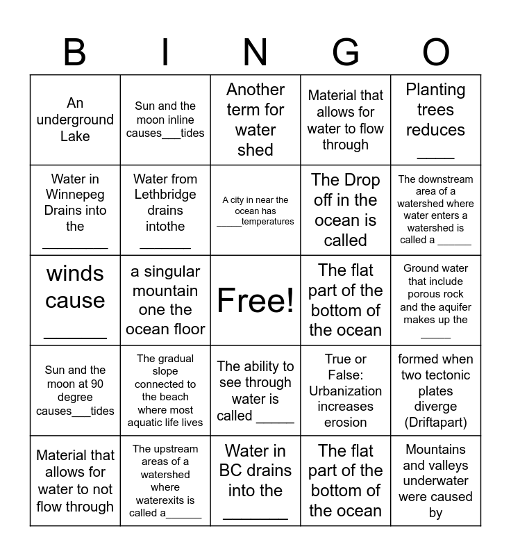 This bingo card has a free space and 27 words: True or False: Urbanization increases erosion, True or False: Frozen water holds salt, The Drop off in the ocean is called, Water in BC drains into the _______, Water in Winnepeg Drains into the _________, Another term for water shed, Sun and the moon inline causes___tides, Sun and the moon at 90 degree causes___tides, The flat part of the bottom of the ocean, formed when two tectonic plates diverge (Driftapart), winds cause _____, Material that allows for water to flow through, Material that allows for water to not flow through, The upstream areas of a watershed where waterexits is called a______, The downstream area of a watershed where water enters a watershed is called a ______, formed when two tectonic plates converge (Come together), Water from Lethbridge drains intothe _______, A city in near the ocean has _____temperatures, The gradual slope connected to the beach where most aquatic life lives, An underground Lake, Ground water that include porous rock and the aquifer makes up the _____, The flat part of the bottom of the ocean, a singular mountain one the ocean floor, Mountains and valleys underwater were caused by, The ability to see through water is called _____, Planting trees reduces ____ and What does not affect erosion.