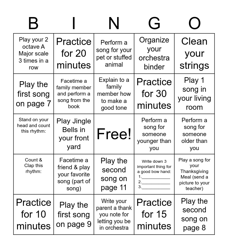 This bingo card has a free space and 24 words: Practice for 10 minutes, Facetime a friend & play your favorite song (part of song), Explain to a family member how to make a good tone, Practice for 15 minutes, Clean your strings, Play your 2 octave A Major scale 3 times in a row, Practice for 20 minutes, Perform a song for your pet or stuffed animal, Perform a song for someone younger than you, Perform a song for someone older than you, Stand on your head and count this rhythm:, Facetime a family member and perform a song from the book, Write down 3 important thing for a good bow hand: 1.____________ 2.____________ 3.____________, Play a song for your Thanksgiving Meal (send a picture to your teacher), Play the first song on page 7, Play the first song on page 9, Write your parent a thank you note for letting you be in orchestra, Organize your orchestra binder, Play 1 song in your living room, Count & Clap this rhythm:, Play Jingle Bells in your front yard, Play the second song on page 11, Practice for 30 minutes and Play the second song on page 8.