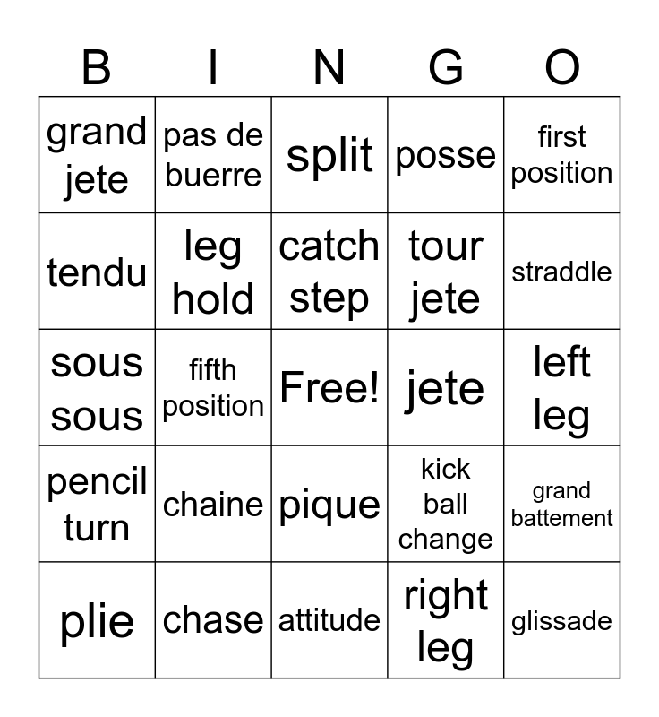 This bingo card has a free space and 24 words: chaine, chase, catch step, plie, first position, grand jete, tendu, pas de buerre, jete, pique, tour jete, sous sous, kick ball change, grand battement, leg hold, right leg, left leg, split, straddle, fifth position, glissade, pencil turn, posse and attitude.