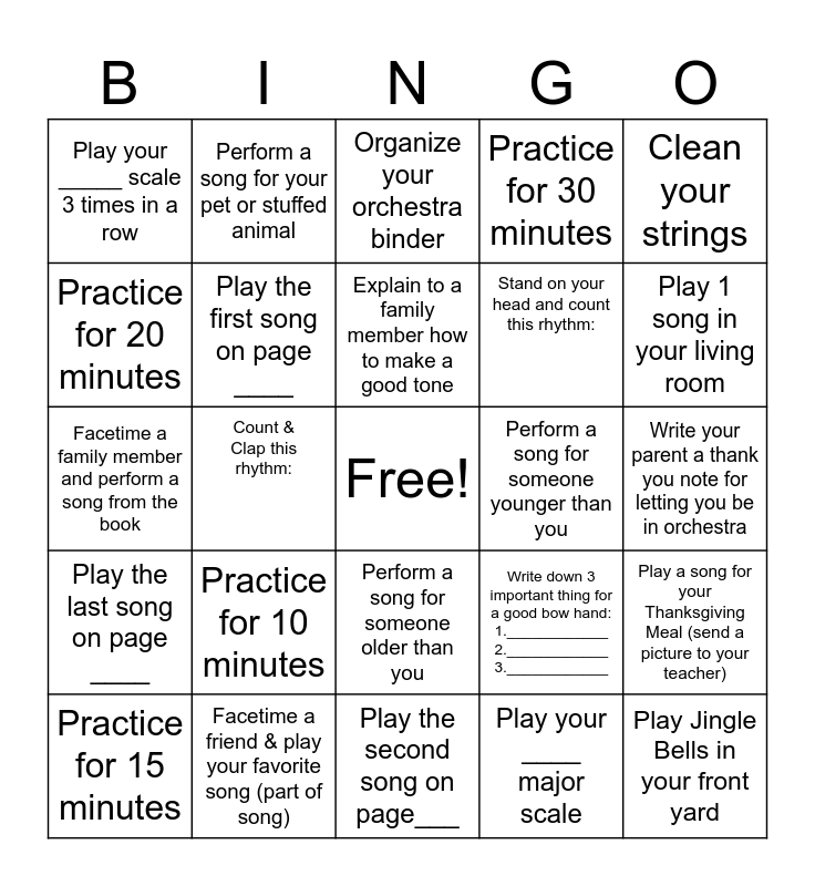 This bingo card has a free space and 24 words: Practice for 10 minutes, Facetime a friend & play your favorite song (part of song), Explain to a family member how to make a good tone, Practice for 15 minutes, Clean your strings, Play your _____ scale 3 times in a row, Practice for 20 minutes, Perform a song for your pet or stuffed animal, Perform a song for someone younger than you, Perform a song for someone older than you, Stand on your head and count this rhythm:, Facetime a family member and perform a song from the book, Write down 3 important thing for a good bow hand: 1.____________ 2.____________ 3.____________, Play a song for your Thanksgiving Meal (send a picture to your teacher), Play the first song on page ____, Play your ____ major scale, Write your parent a thank you note for letting you be in orchestra, Organize your orchestra binder, Play 1 song in your living room, Count & Clap this rhythm:, Play Jingle Bells in your front yard, Play the last song on page ____, Practice for 30 minutes and Play the second song on page___.