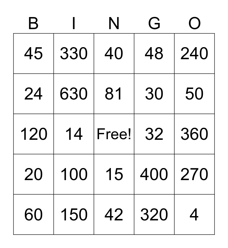 This bingo card has a free space and 39 words: 12, 10, 22, 630, 60, 15, 81, 33, 240, 20, 14, 48, 4, 360, 32, 100, 21, 45, 18, 400, 24, 42, 30, 50, 8, 27, 28, 9, 72, 330, 80, 70, 40, 150, 320, 180, 270, 120 and 44.