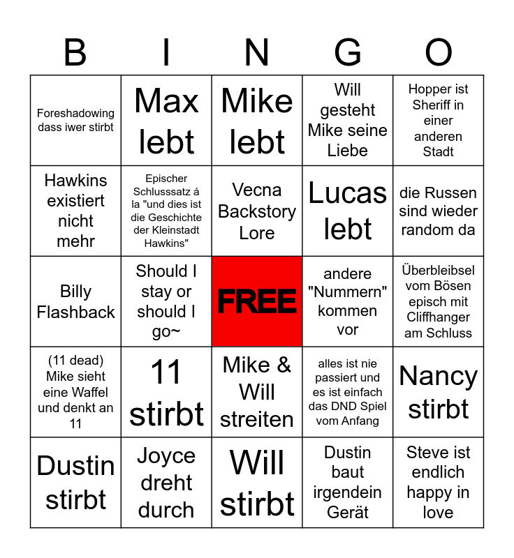 This bingo card has a free space and 24 words: 11 stirbt, Joyce dreht durch, Vecna Backstory Lore, Dustin stirbt, Hopper ist Sheriff in einer anderen Stadt, Foreshadowing dass iwer stirbt, Hawkins existiert nicht mehr, Max lebt, andere "Nummern" kommen vor, Mike & Will streiten, Lucas lebt, Billy Flashback, alles ist nie passiert und es ist einfach das DND Spiel vom Anfang, Nancy stirbt, Epischer Schlusssatz á la "und dies ist die Geschichte der Kleinstadt Hawkins", Dustin baut irgendein Gerät, Überbleibsel vom Bösen episch mit Cliffhanger am Schluss, Mike lebt, die Russen sind wieder random da, Should I stay or should I go~, Steve ist endlich happy in love, (11 dead) Mike sieht eine Waffel und denkt an 11, Will gesteht Mike seine Liebe and Will stirbt.