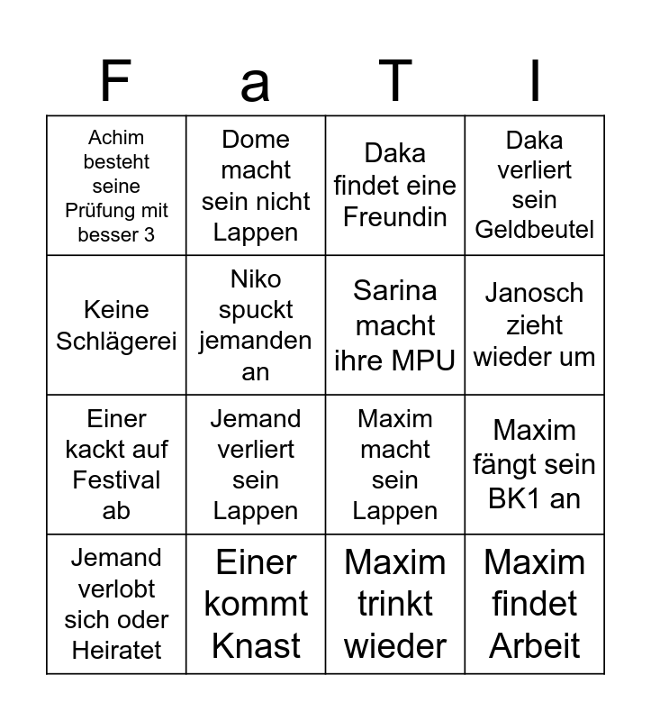 This bingo card has 16 words: Einer kommt Knast, Maxim fängt sein BK1 an, Daka findet eine Freundin, Achim besteht seine Prüfung mit besser 3, Einer kackt auf Festival ab, Dome macht sein nicht Lappen, Maxim macht sein Lappen, Maxim trinkt wieder, Keine Schlägerei, Niko spuckt jemanden an, Jemand verlobt sich oder Heiratet, Daka verliert sein Geldbeutel, Jemand verliert sein Lappen, Janosch zieht wieder um, Sarina macht ihre MPU and Maxim findet Arbeit.