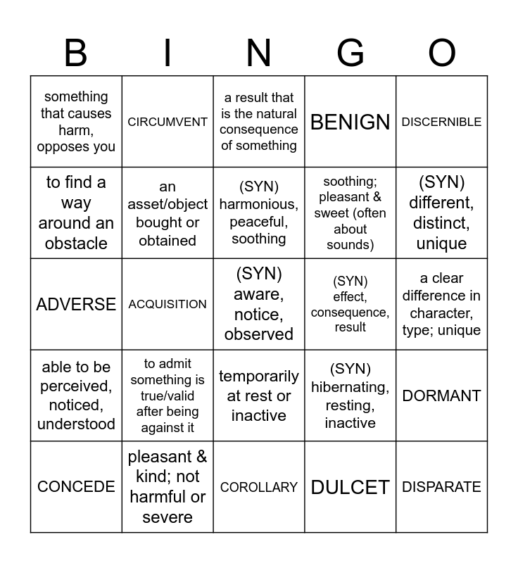 This bingo card has 25 words: to admit something is true/valid after being against it, COROLLARY, (SYN) harmonious, peaceful, soothing, CONCEDE, DISCERNIBLE, something that causes harm, opposes you, to find a way around an obstacle, CIRCUMVENT, (SYN) effect, consequence, result, temporarily at rest or inactive, soothing; pleasant & sweet (often about sounds), ADVERSE, (SYN) hibernating, resting, inactive, DORMANT, an asset/object bought or obtained, DISPARATE, a clear difference in character, type; unique, a result that is the natural consequence of something, (SYN) different, distinct, unique, ACQUISITION, (SYN) aware, notice, observed, pleasant & kind; not harmful or severe, able to be perceived, noticed, understood, BENIGN and DULCET.