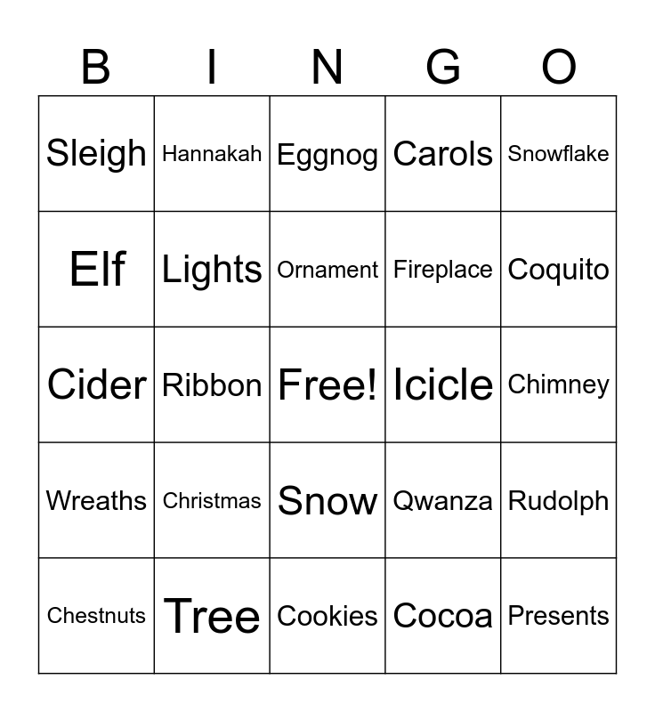 This bingo card has a free space and 24 words: Christmas, Tree, Ornament, Chestnuts, Snowflake, Sleigh, Elf, Hannakah, Icicle, Snow, Fireplace, Cider, Qwanza, Rudolph, Lights, Cocoa, Chimney, Eggnog, Coquito, Ribbon, Presents, Wreaths, Carols and Cookies.