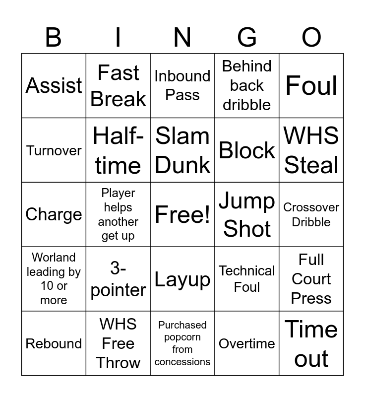 This bingo card has a free space and 24 words: 3-pointer, WHS Free Throw, Slam Dunk, Rebound, Foul, Assist, Turnover, Fast Break, Jump Shot, Layup, Block, Charge, Technical Foul, Full Court Press, Half-time, Overtime, Crossover Dribble, Inbound Pass, WHS Steal, Player helps another get up, Time out, Worland leading by 10 or more, Behind back dribble and Purchased popcorn from concessions.
