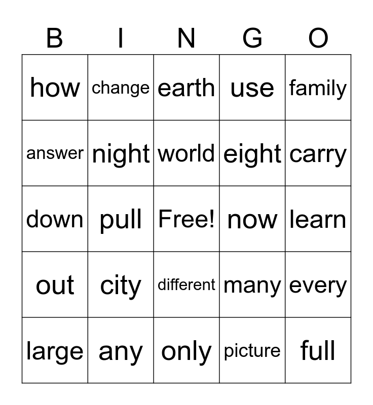 This bingo card has a free space and 24 words: city, any, world, large, family, how, answer, change, now, different, eight, down, many, every, night, picture, learn, earth, carry, pull, full, out, use and only.