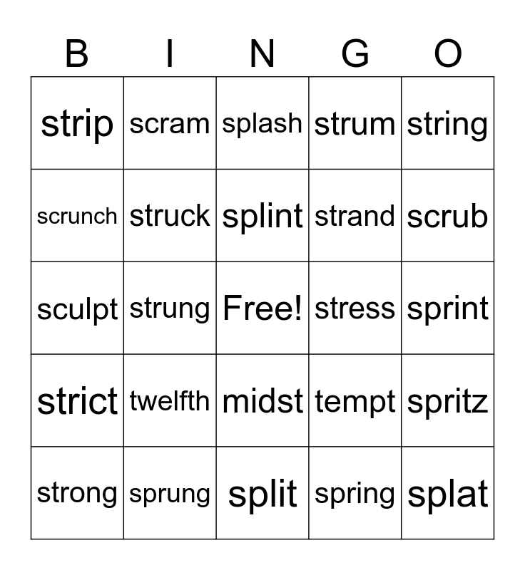 This bingo card has a free space and 29 words: strong, scrap, strung, prompt, strip, splash, struck, twelfth, stress, sprung, sprint, splat, split, spring, scrub, strap, midst, strict, string, sculpt, tempt, strut, strand, scrunch, strum, scram, spritz, splint and script.