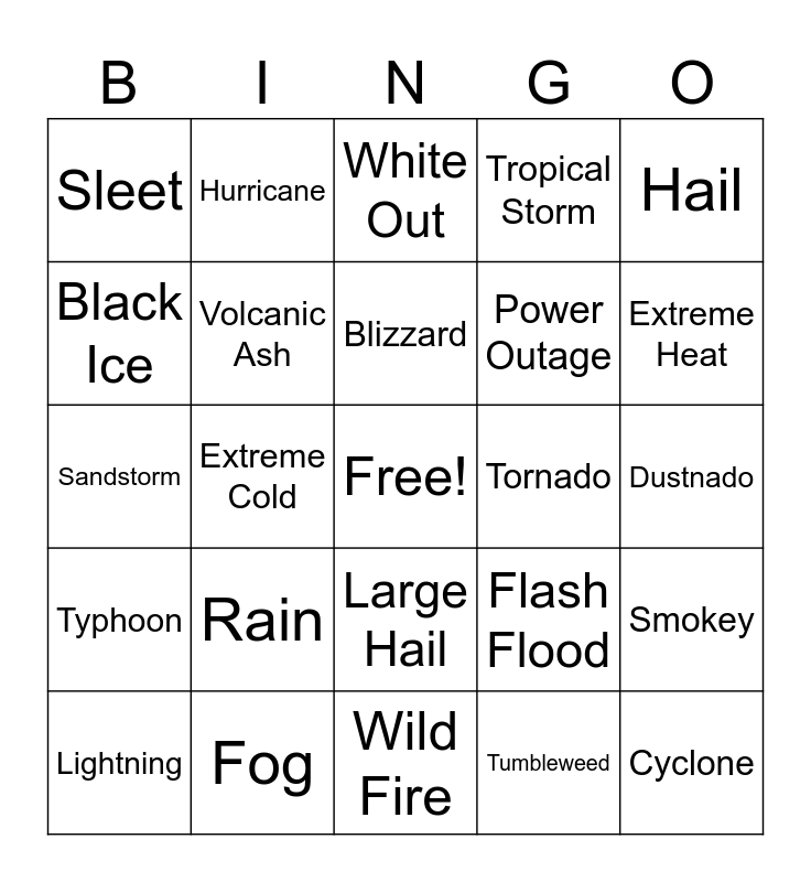 This bingo card has a free space and 24 words: Rain, Fog, Blizzard, Lightning, Hail, Sleet, Black Ice, Hurricane, Tornado, Large Hail, Power Outage, Sandstorm, Flash Flood, Smokey, Volcanic Ash, Tumbleweed, Dustnado, White Out, Extreme Heat, Extreme Cold, Cyclone, Typhoon, Tropical Storm and Wild Fire.