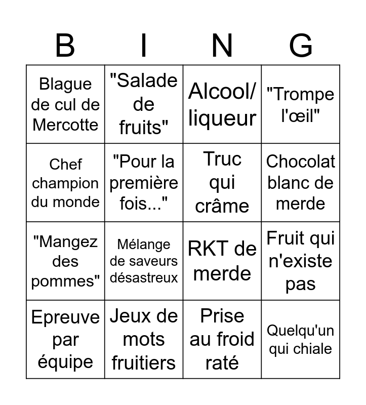 This bingo card has 16 words: Jeux de mots fruitiers, Fruit qui n'existe pas, Alcool/ liqueur, Blague de cul de Mercotte, "Mangez des pommes", "Salade de fruits", RKT de merde, Prise au froid raté, Chef champion du monde, "Pour la première fois...", Epreuve par équipe, "Trompe l'œil", Mélange de saveurs désastreux, Chocolat blanc de merde, Truc qui crâme and Quelqu'un qui chiale.