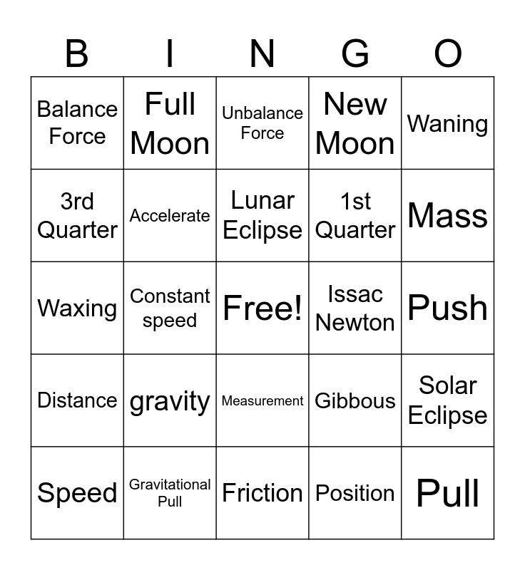 This bingo card has a free space and 29 words: Speed, force, Constant speed, Motion, Balance Force, Unbalance Force, Accelerate, gravity, Issac Newton, Gravitational Pull, Push, Pull, Friction, Position, Mass, Direction, Measurement, Distance, Waning, Waxing, Gibbous, Crescent, 1st Quarter, 3rd Quarter, New Moon, Full Moon, Solar Eclipse, Lunar Eclipse and Rotation.