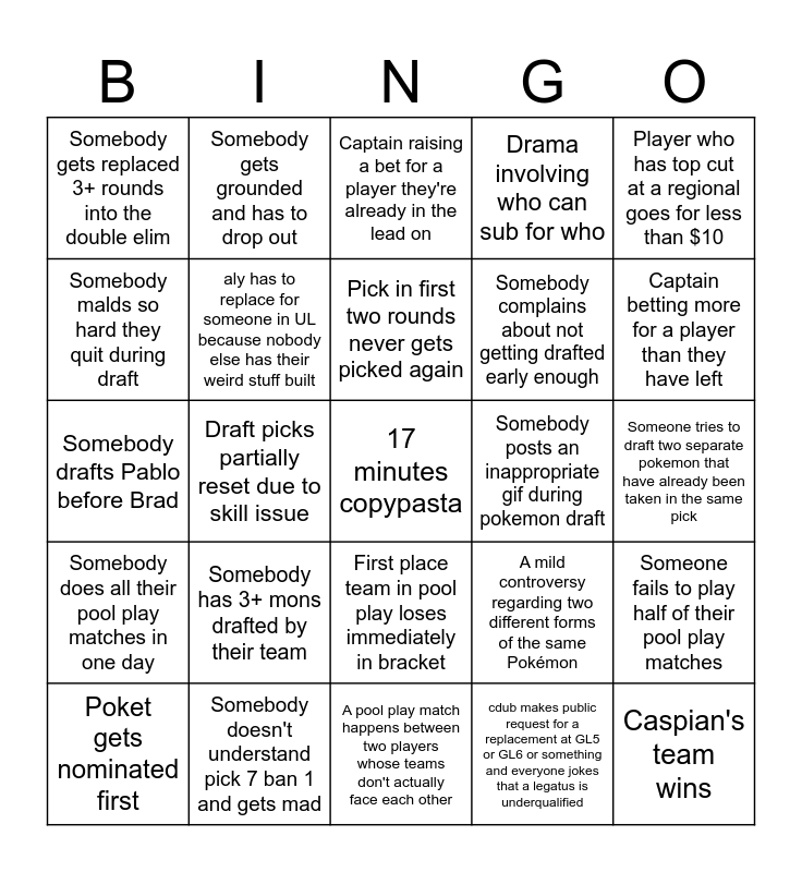 This bingo card has a free space and 24 words: Somebody has 3+ mons drafted by their team, Somebody doesn't understand pick 7 ban 1 and gets mad, Pick in first two rounds never gets picked again, Poket gets nominated first, Player who has top cut at a regional goes for less than $10, Somebody gets replaced 3+ rounds into the double elim, Somebody malds so hard they quit during draft, Somebody gets grounded and has to drop out, Somebody posts an inappropriate gif during pokemon draft, First place team in pool play loses immediately in bracket, Somebody complains about not getting drafted early enough, Somebody drafts Pablo before Brad, A mild controversy regarding two different forms of the same Pokémon, Someone fails to play half of their pool play matches, aly has to replace for someone in UL because nobody else has their weird stuff built, cdub makes public request for a replacement at GL5 or GL6 or something and everyone jokes that a legatus is underqualified, Someone tries to draft two separate pokemon that have already been taken in the same pick, Captain raising a bet for a player they're already in the lead on, Captain betting more for a player than they have left, Draft picks partially reset due to skill issue, Caspian's team wins, Somebody does all their pool play matches in one day, Drama involving who can sub for who and A pool play match happens between two players whose teams don't actually face each other.