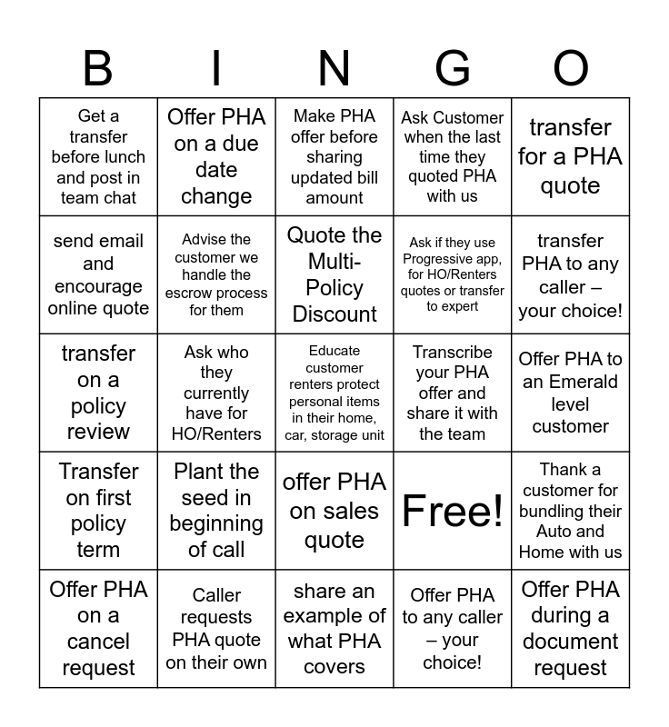 This bingo card has 25 words: Plant the seed in beginning of call, share an example of what PHA covers, Quote the Multi-Policy Discount, Offer PHA on a cancel request, transfer for a PHA quote, Get a transfer before lunch and post in team chat, send email and encourage online quote, Offer PHA on a due date change, Transcribe your PHA offer and share it with the team, offer PHA on sales quote, Ask if they use Progressive app, for HO/Renters quotes or transfer to expert, transfer on a policy review, Free!, Thank a customer for bundling their Auto and Home with us, Advise the customer we handle the escrow process for them, Offer PHA during a document request, Offer PHA to an Emerald level customer, Make PHA offer before sharing updated bill amount, transfer PHA to any caller – your choice!, Ask who they currently have for HO/Renters, Educate customer renters protect personal items in their home, car, storage unit, Caller requests PHA quote on their own, Transfer on first policy term, Ask Customer when the last time they quoted PHA with us and Offer PHA to any caller – your choice!.