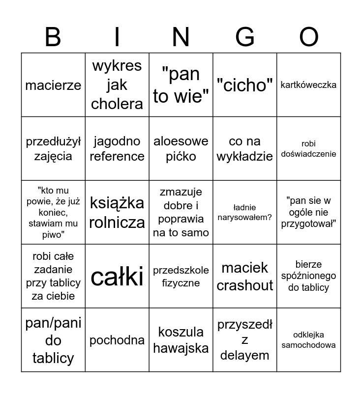 This bingo card has a free space and 24 words: całki, pochodna, aloesowe pićko, pan/pani do tablicy, kartkóweczka, macierze, przedłużył zajęcia, wykres jak cholera, ładnie narysowałem?, przedszkole fizyczne, co na wykładzie, "kto mu powie, że już koniec, stawiam mu piwo", maciek crashout, bierze spóźnionego do tablicy, jagodno reference, przyszedł z delayem, "pan sie w ogóle nie przygotował", "pan to wie", robi doświadczenie, książka rolnicza, odklejka samochodowa, robi całe zadanie przy tablicy za ciebie, "cicho" and koszula hawajska.