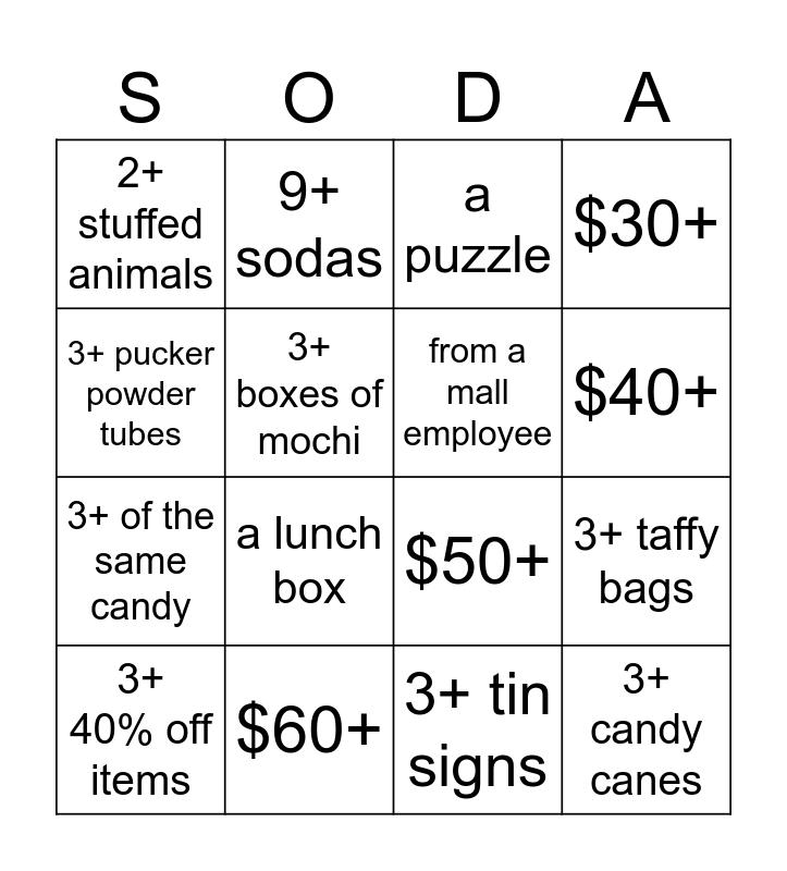 This bingo card has 16 words: $60+, 3+ taffy bags, a puzzle, 2+ stuffed animals, 3+ of the same candy, 9+ sodas, $50+, 3+ tin signs, 3+ pucker powder tubes, 3+ boxes of mochi, 3+ 40% off items, $30+, a lunch box, $40+, from a mall employee and 3+ candy canes.