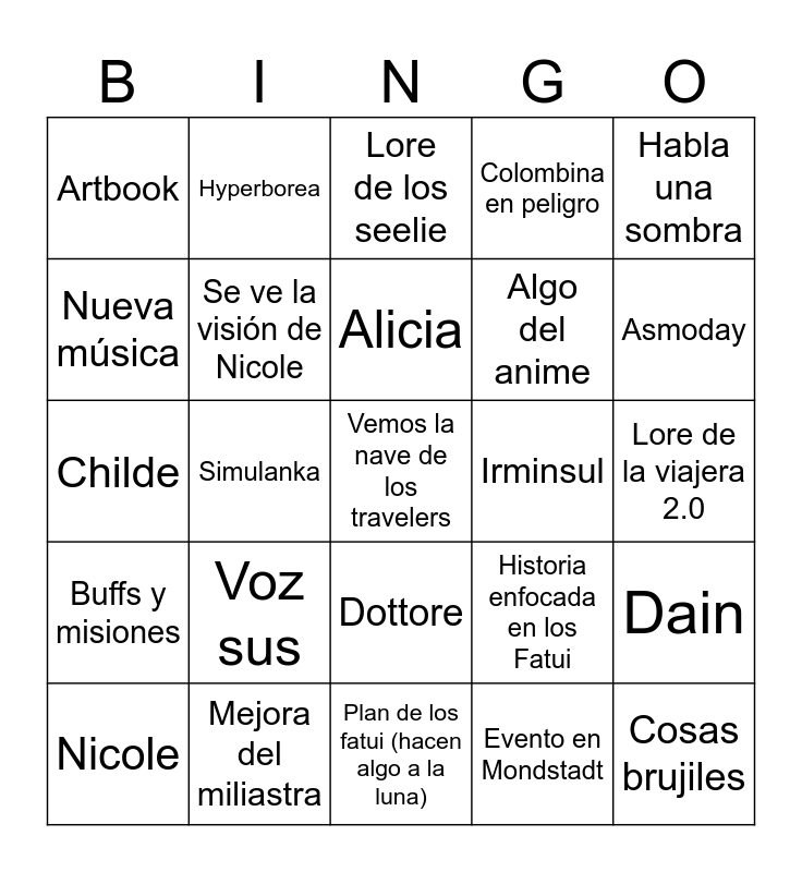 This bingo card has a free space and 24 words: Voz sus, Mejora del miliastra, Alicia, Nicole, Habla una sombra, Artbook, Nueva música, Hyperborea, Irminsul, Dottore, Algo del anime, Childe, Historia enfocada en los Fatui, Dain, Se ve la visión de Nicole, Evento en Mondstadt, Lore de la viajera 2.0, Lore de los seelie, Asmoday, Simulanka, Cosas brujiles, Buffs y misiones, Colombina en peligro and Plan de los fatui (hacen algo a la luna).
