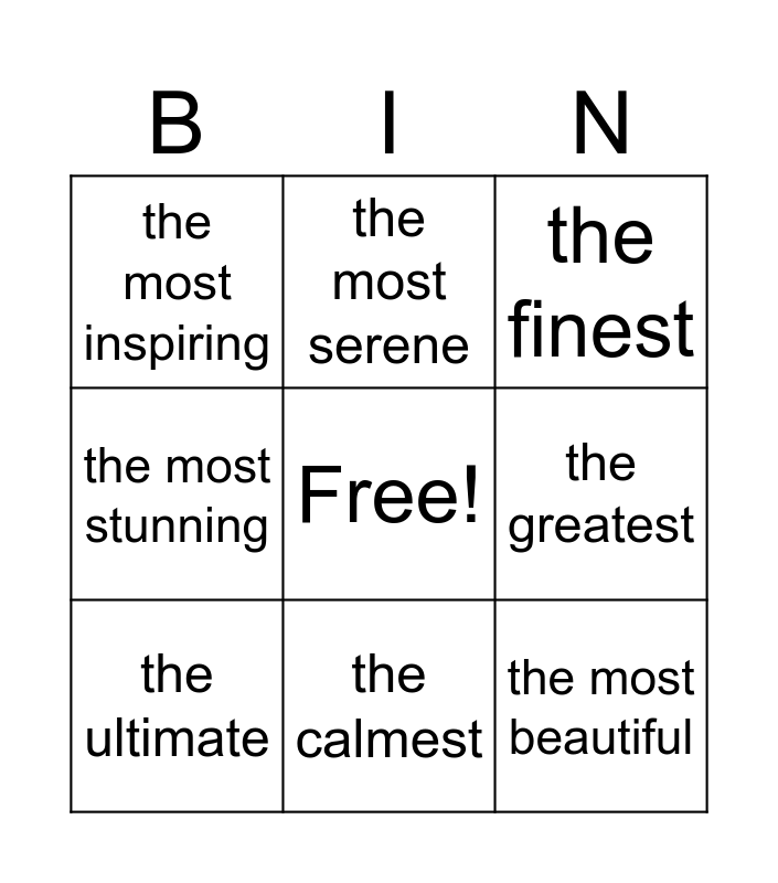 This bingo card has a free space and 8 words: the greatest, the finest, the most serene, the ultimate, the most inspiring, the most beautiful, the most stunning and the calmest.