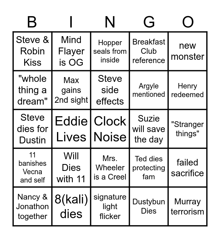 This bingo card has a free space and 24 words: Will Dies with 11, 8(kali) dies, Steve side effects, Nancy & Jonathon together, new monster, Steve & Robin Kiss, "whole thing a dream", Mind Flayer is OG, Suzie will save the day, Mrs. Wheeler is a Creel, Argyle mentioned, Steve dies for Dustin, Ted dies protecting fam, failed sacrifice, Max gains 2nd sight, Dustybun Dies, "Stranger things", Hopper seals from inside, Henry redeemed, Eddie Lives, Murray terrorism, 11 banishes Vecna and self, Breakfast Club reference and signature light flicker.