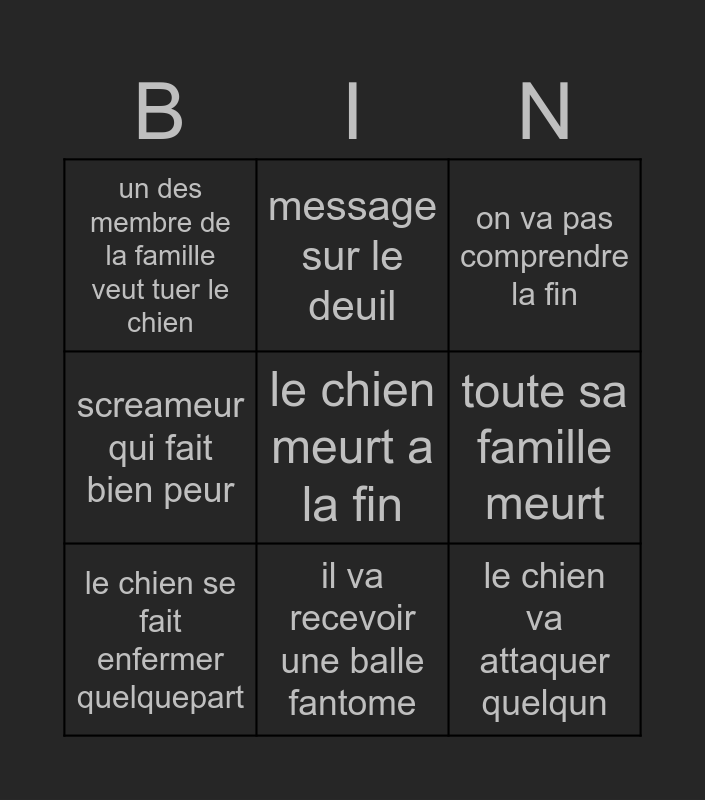 This bingo card has a free space and 8 words: toute sa famille meurt, on va pas comprendre la fin, message sur le deuil, le chien se fait enfermer quelquepart, un des membre de la famille veut tuer le chien, le chien va attaquer quelqun, screameur qui fait bien peur and il va recevoir une balle fantome.