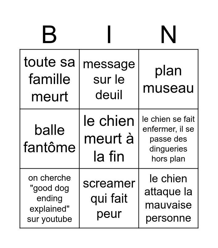 This bingo card has a free space and 8 words: le chien se fait enfermer, il se passe des dingueries hors plan, plan museau, message sur le deuil, on cherche "good dog ending explained" sur youtube, toute sa famille meurt, le chien attaque la mauvaise personne, balle fantôme and screamer qui fait peur.