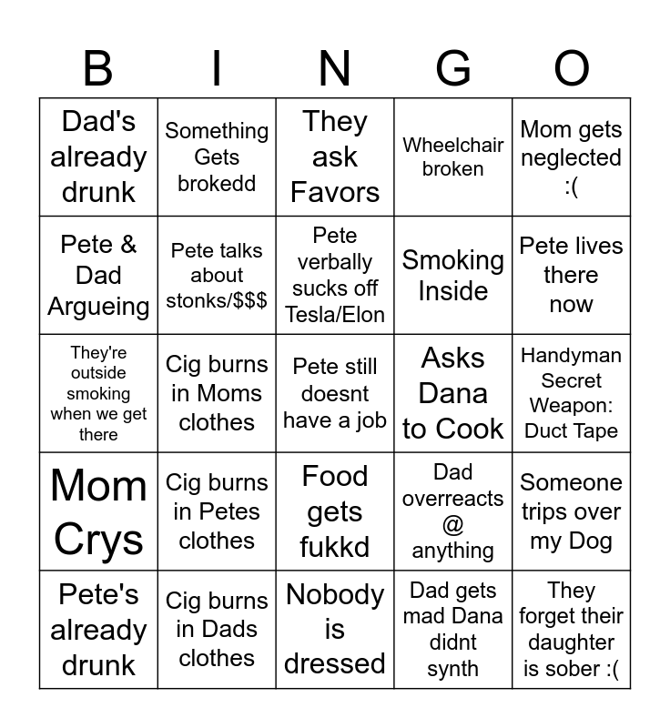 This bingo card has a free space and 24 words: Pete's already drunk, Cig burns in Petes clothes, Pete verbally sucks off Tesla/Elon, Dad gets mad Dana didnt synth, Mom gets neglected :(, Dad's already drunk, Something Gets brokedd, They ask Favors, Asks Dana to Cook, Handyman Secret Weapon: Duct Tape, They're outside smoking when we get there, Pete talks about stonks/$$$, Dad overreacts @ anything, Someone trips over my Dog, Pete & Dad Argueing, Cig burns in Dads clothes, Nobody is dressed, Wheelchair broken, Pete lives there now, Mom Crys, Cig burns in Moms clothes, Food gets fukkd, Smoking Inside and They forget their daughter is sober :(.