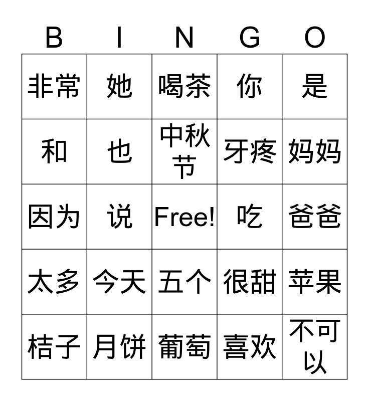 This bingo card has a free space and 24 words: 今天, 月饼, 中秋节, 桔子, 是, 非常, 和, 她, 吃, 五个, 牙疼, 因为, 很甜, 苹果, 也, 喜欢, 爸爸, 喝茶, 妈妈, 说, 不可以, 太多, 你 and 葡萄.