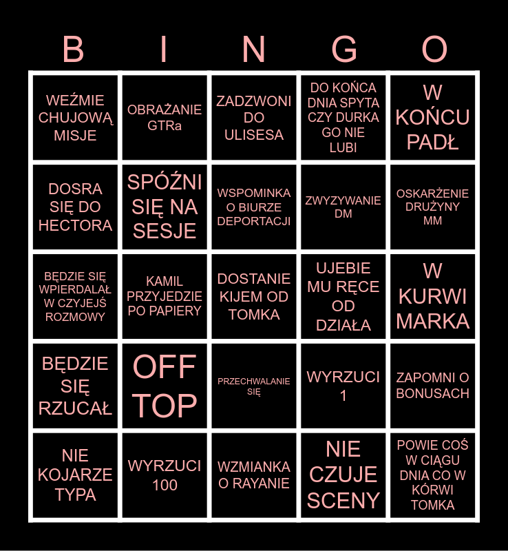 This bingo card has 25 words: OFF TOP, WZMIANKA O RAYANIE, WSPOMINKA O BIURZE DEPORTACJI, NIE KOJARZE TYPA, W KOŃCU PADŁ, WEŹMIE CHUJOWĄ MISJE, DOSRA SIĘ DO HECTORA, OBRAŻANIE GTRa, UJEBIE MU RĘCE OD DZIAŁA, PRZECHWALANIE SIĘ, ZWYZYWANIE DM, BĘDZIE SIĘ WPIERDALAŁ W CZYJEJŚ ROZMOWY, WYRZUCI 1, ZAPOMNI O BONUSACH, SPÓŹNI SIĘ NA SESJE, POWIE COŚ W CIĄGU DNIA CO W KÓRWI TOMKA, W KURWI MARKA, ZADZWONI DO ULISESA, OSKARŻENIE DRUŻYNY MM, KAMIL PRZYJEDZIE PO PAPIERY, DOSTANIE KIJEM OD TOMKA, WYRZUCI 100, BĘDZIE SIĘ RZUCAŁ, DO KOŃCA DNIA SPYTA CZY DURKA GO NIE LUBI and NIE CZUJE SCENY.