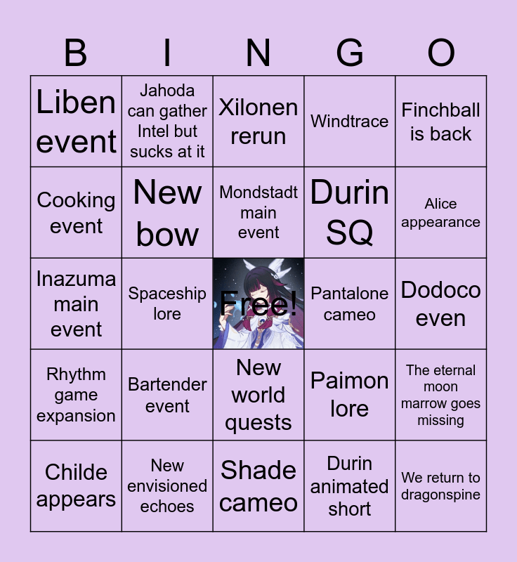 This bingo card has a free space and 78 words: Neuvillette rerun, Varesa rerun, Xilonen rerun, Mondstadt chronicled wish, Venti rerun, Wriothesley rerun, Chiori rerun, Sigewinne rerun, Lyney rerun, Fontaine chronicled wish, Ineffa rerun, Lost riches event, Windtrace, Liben event, Music festival event, Cooking event, Tea party with Sandrone, Bartender event, Hexenzirkel event, Dodoco even, Management sim event, Finchball is back, Inazuma main event, Mondstadt main event, New bow, New polearm, Sinner cameo, Dottore appears, House of the harth cameos, Klee cameo, Alice appearance, Nicole cameo, Shade cameo, New witch code/named, Childe appears, Pantalone cameo, Moon marrow lore, Rerir is back, Stuzha crumbs, We return to dragonspine, Thoth lore, Map expansion, Previous WQ mention, Jahoda gets flustered, Dain disappears, Jahoda can gather Intel but sucks at it, Snowland Fae lore, Horses, Varka gets drunk, Jean appearance, The eternal moon marrow goes missing, Spaceship lore, Paimon lore, Kaeya in nod krai, Diluc in nod krai, Venti in nod krai, Navia in nod krai, Ainos creation goes haywire, New nefer intel quests, New world quests, Durin SQ, Wanderer SQ, Durins wings work as glider, Festering desire mention, Durin spits fire, Wanderer and Durin meet, Shy durin, Albedo 2nd SQ, Rhythm game expansion, New envisioned echoes, New collab announcement, Anime news, Traveller cosmetics, Winter miliastra wonderland outfits, Durin animated short, Old character buffs, New anecdotes and Spiral abyss expansion.