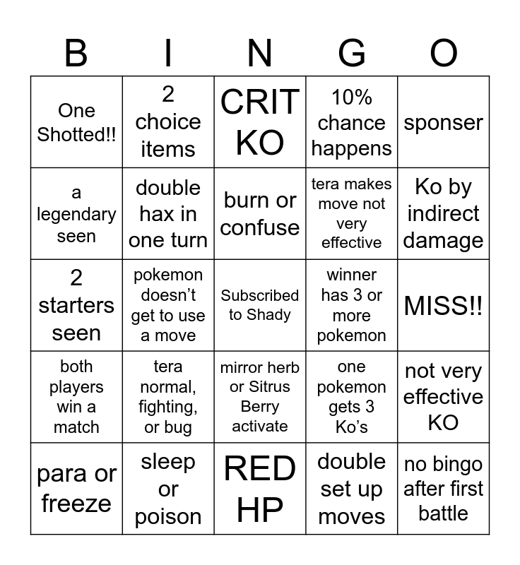 This bingo card has a free space and 24 words: tera normal, fighting, or bug, sleep or poison, burn or confuse, para or freeze, sponser, One Shotted!!, a legendary seen, 2 choice items, winner has 3 or more pokemon, mirror herb or Sitrus Berry activate, tera makes move not very effective, 2 starters seen, one pokemon gets 3 Ko’s, not very effective KO, double hax in one turn, double set up moves, MISS!!, CRIT KO, Ko by indirect damage, pokemon doesn’t get to use a move, no bingo after first battle, both players win a match, 10% chance happens and RED HP.