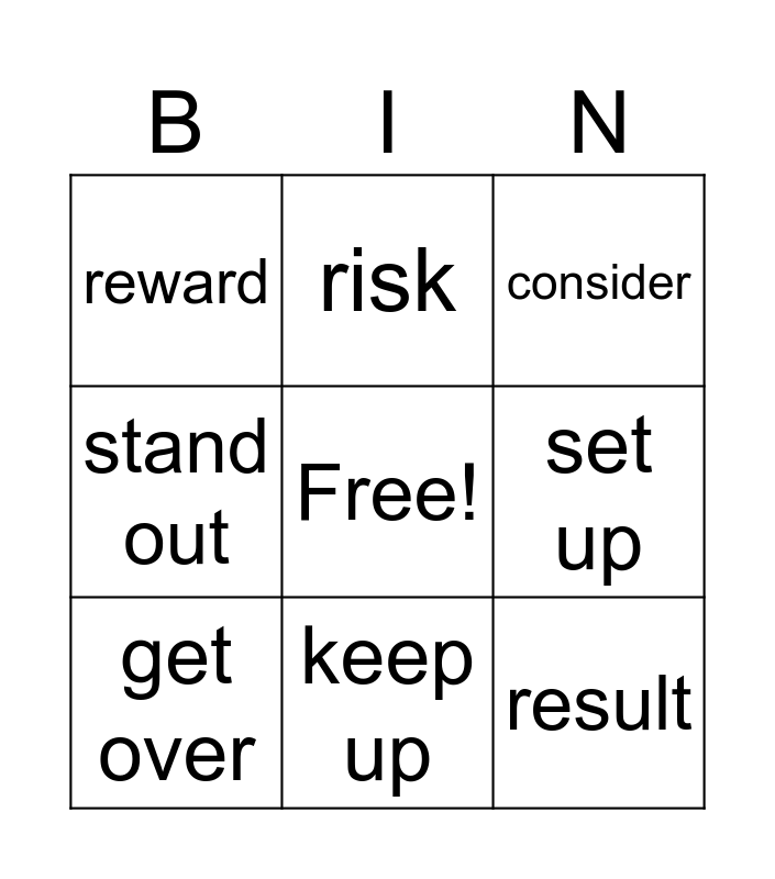 This bingo card has a free space and 20 words: advantage, purpose, consider, research, disadvantage, result, effect, reward, goal, risk, option, situation, set up, work out, get over, work at, keep up, stand out, figure out and give up.